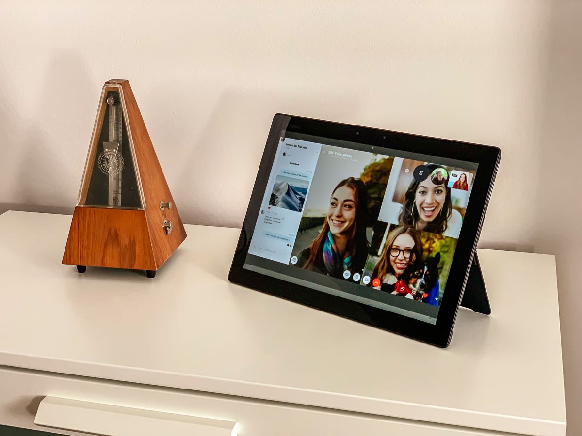 Takže to řeším tak, že z tabletu odtrhnu klávesnici, vyklopím stojánek, položím jej na nějakou podložku (postel, stolek, skříňku), sednu do oblíbeného křesla, přisunu k tabletu a s rodinou si povídáme. Můžu si vše nastavit tak, abych měl dobré světlo a zároveň na mě bylo normálně vidět. Opět bez kabelů, bez klávesnice, s minimem prostoru a téměř neomezenou flexibilitou.