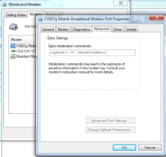 Phone & Modem -> Modems -> Ericsson modem – > Properties -> Advanced.