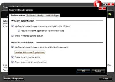 Nyní máte vše hotové a nastavené. Mělo by stačit restartovat PC a užívat si nového nastavení (je možné, že hned po prvním restartu, resp. při prvním zadávání jednotlivých hesel, se funkce čtečky otisků prstu neprobere). Jak by to mělo vypadat, najdete na dalším obrázku.