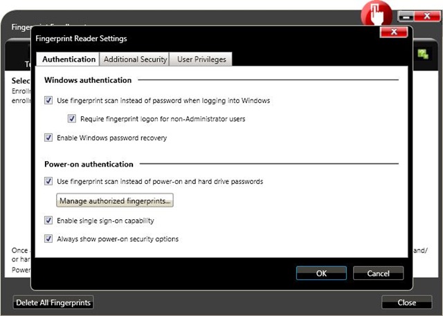 - Podívejte se do nastavení (ikonka “Settings” s nutností UAC), hned v první záložce dole je sekce “Power-on authentication”, kde zkontrolujte, že máte zaškrtlé všechny tři možnosti.