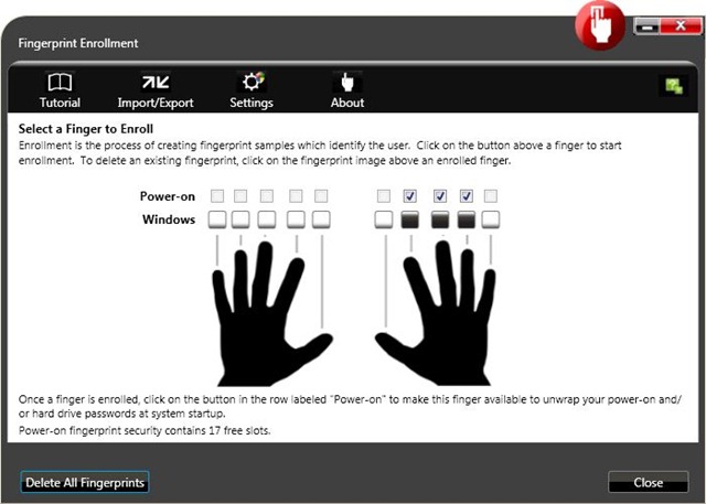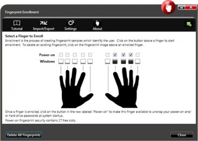 Opět se vrátíme do Windows, kde spustíme aplikaci Lenovo Fingerprint Software (možno spustit i z Client Security Solution). Předpokládám, že otisky prstu používáte pro přihlašování do Windows, máte je tedy “naskenované” a uložené. Pokud ne, učiňte tak!