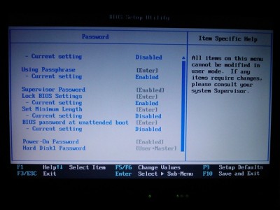 - Nestačí-li ním heslo při zapnutí, můžeme aktivovat i “Hard Disk1 Password”, tedy heslo pevného disku. Volbu, zda chcete pouze uživatelské heslo “User”, nebo i správcovské “Master”, nechám na vás.