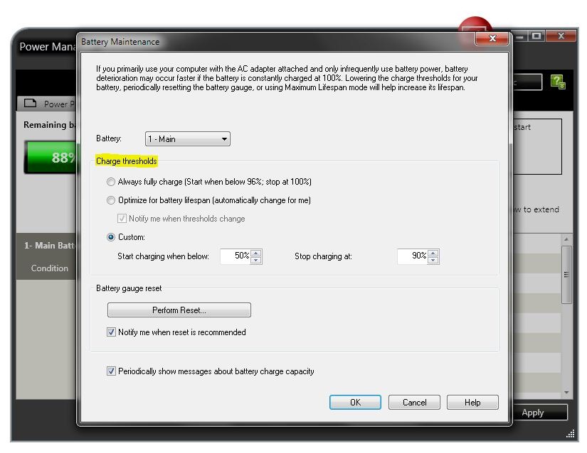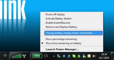ThinkPady jsou kromě jiného pověstné také svou výbornou správou napájení skrze aplikaci ThinkVantage Power Manager. Jednou z jejích možností je i pokročilé nastavení nabíjení, kdy nám aplikace dá možnost určit, kdy se má začít baterie nabíjet (pod jakou mez musí klesnout vybití baterie, aby se aktivovalo nabíjení) a kdy má nabíjení skončit (opět hranicí v procentech). Musím ještě zmínit, že s podobnou vlastností přichází i nové IdeaPady (či G560 a G555 z řady Essential), zde však není možné podrobné nastavení.