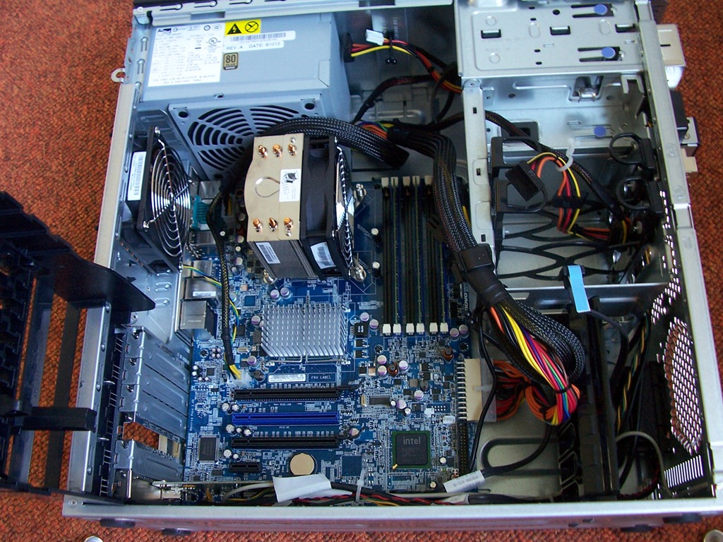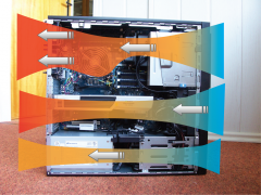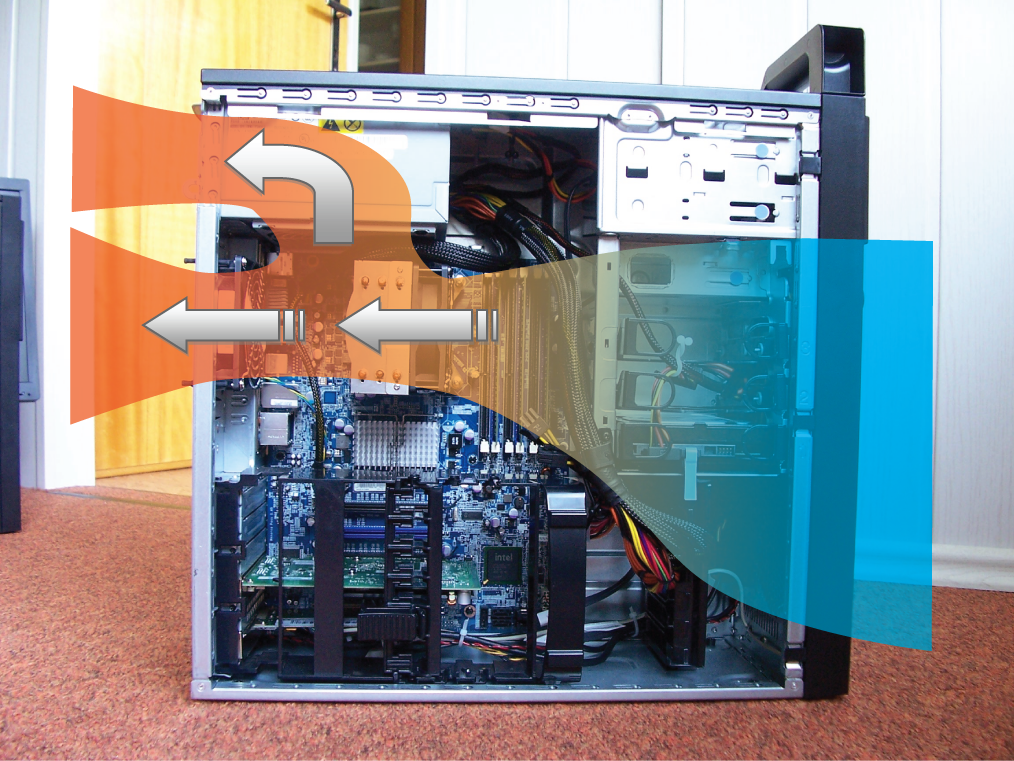 Komponenty S20 jsou umístěné ve skříni standardních rozměrů i rozmístění (tipoval bych miditower, zdroj je v horní části). V testovaném modelu bylo osazeno odlehčené chlazení (věžový chladič s 92 mm ventilátorem na procesoru, 92 mm výstupní ventilátor a samozřejmě 120 mm ve zdroji; vstupní osazený nebyl – jeho umístění je jinak velmi dobře vyřešené, protože proudění vzduchu nebrání žádná překážka). Celkově hodnotím chlazení na výbornou, protože je opravdu velmi tiché, schéma proudění vzduchu je na obrázku.