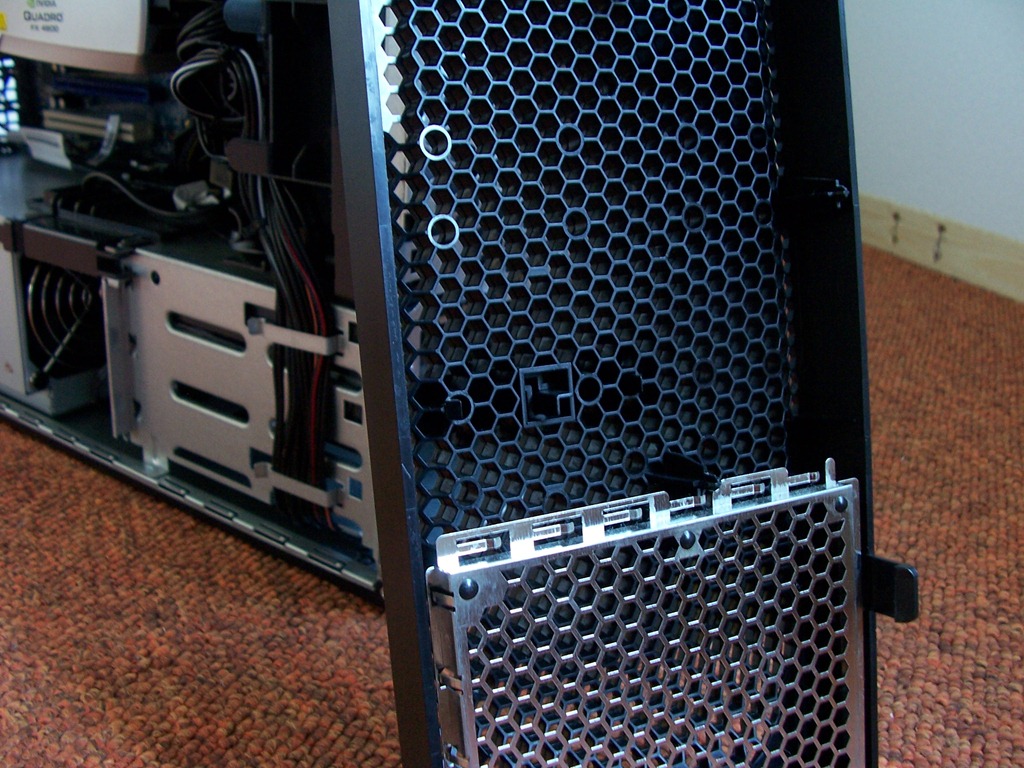 Podpora velkých PCI karet je v případě C20 řešená lépe – boční držáky jsou plastové, samozřejmě stavitelné, ovšem zasazené do masivního kovového křídla z milimetrového plechu, které zakrývá celou šířku skříně v prostoru PCI patic, což považuji za velmi spolehlivé a komfortní řešení (důvodem je ovšem především možnost postavení monitoru na bočnici, podpora PCI karet tak bok zpevní). Přední lyžiny jsou samozřejmě přítomné taky, pro Quadro FX 4800 (s instalovanou kovovou „ploutví“) nutné.