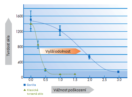 Gorilla glass je, jak bylo asi z popisu jasné, druhem chemicky tvrzeného skla, který vyvinula společnost Corning. Jeho vlastnosti jsou pro mobilní elektroniku vyloženě vhodné – oproti běžnému tvrzenému sklu odolává více než osmkrát lépe nárazu, oděru i tlaku. I po poškození si je Gorilla glass schopné zachovat výrazně nezměněnou tvrdost a odolnost mnohem déle (viz. graf níže pro techničtěji založené čtenáře).