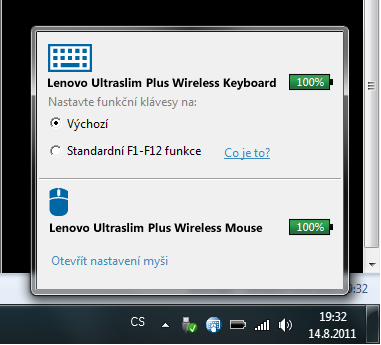 Do klávesnice vložíme dvojici dodaných mikrotužkových baterií, do myši dvě klasické “tužkovky”. Oba páry jsou již v balení, jedná se o kvalitní baterie Energizer. Ukazatelem stavu nabití disponuje pouze myš, klávesnice nikoliv. Konkrétně si můžeme prohlédnout stav baterií v ovládací utilitě, která je automaticky zadokovaná vedle hodin v malé ikonce. Lenovo udává, že myš by měla vydržet 6 měsíců na jeden pár baterií, klávesnice až rok. Vzhledem ke zkušenostem s Bluetooth myší věřím, že se toho dá dosáhnout.