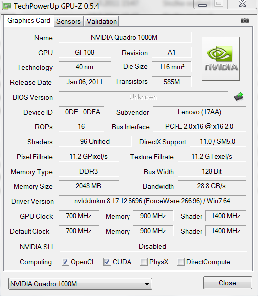 - nVIDIA Quadro 1000M (96 výpočetních jednotek, 2 GB GDDR3 128bit, Optimus)