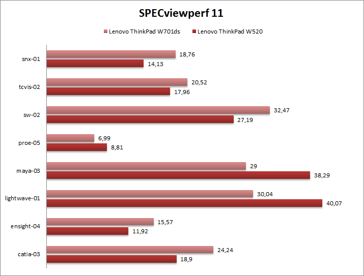 | SPECviewperf 11 | catia-03: 18,90 ensight-04: 11,92 lightwave-01: 40,07 maya-03: 38,29 proe-05: 8,81 sw-02: 27,19 tcvis-02: 17,96 snx-01: 14,13 |