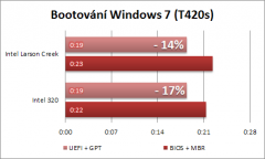 Oba disky jsme testovali v ThinkPadu T420s a zároveň měřili rychlost bootování. Vždy se jednalo o totožnou instalaci Windows 7 Professional x64 SP1 s nainstalovanými ovladači, ThinkVantage Tools a RapidBoot. Zkoušeli jsme samozřejmě bootování jak v režimu BIOSu (MBR), tak UEFI (samozřejmě s GPT), které by mělo být rychlejší.
