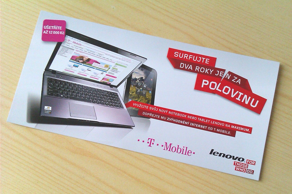 Lenovo v současné době spustilo ve spolupráci s mobilním operátorem T-Mobile zajímavou akci, o které je, myslím, dobré, informovat naše čtenáře, resp. co nejvíc lidí. Pokud si dnes koupíte notebook Lenovo, naleznete u něj také kupón na 50% slevu z mobilního internetu T-Mobile.Na krabici s vašim novým notebookem, netbookem, tabletem nebo all-in-one Lenovo najdete nalepený kupón (poukaz) s 14místným unikátním kódem, díky kterému získáte nárok na slevu 50 % z mobilního internetu T-Mobile. Je nutné uzavřít úvazek na 2 roky, nicméně sleva platí po celou dobu úvazku (v tomto případě se tedy nejedná o akci typu “6 měsíců se slevou”), dokonce i v případě, že by došlo k jakýmkoliv změnám v ceně, stále bude vždy o polovinu snížená.