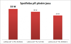 Lenovo v oficiálních parametrech udává typickou spotřebu 30 W a maximální 40 W. Při maximálním jasu si displej řekne o 33 W, s 50% jasem to je 22 W a snížíme-li jas na minimum, je to 19 W. 24″ IPS displej s jasem 300 nit tak spotřebuje jen něco přes 30 W, což je, myslím, moc pěkná hodnota a příliš se nevzdaluje od mého 22″ TN LED L2251x (26 W) nebo 23″ L2321x s podporou dvou obrazů (30 W).
