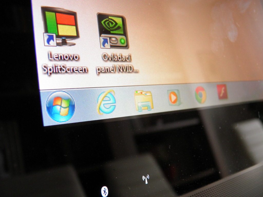 Většinu přední strany zabírá samozřejmě 23″ displej v bezrámečkové úpravě, tedy překrytý sklem (jednoznačně se nejedná o plast, ale sklo, naprosto stejné jako u ThinkCenteru Edge 91z, ani v tomto případě jsem však nebyl schopen dohledat, o jaký druh se jedná – mělo by však jít o známou Gorillu), v jehož rámečku se kromě webové kamery ukrývá také trojice indikačních diod vlevo (pevný disk, Bluetooth, Wi-Fi) a vpravo osm dotykových tlačítek, která se podsvítí až při jejich aktivaci dotykem (přepínání LED diody pod displejem indikující úsporný režim, ovládání hlasitosti a jasu displeje, NovoVision – režimy obrazu, přepínání obrazových výstupů a vypínání displeje). Prostor pod displejem už zabírá pouze elegantně působící kovová mřížka reproduktorů s chromovaným okrajem a nalevo velké podsvícené tlačítko napájení.