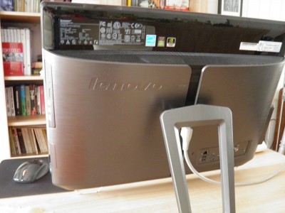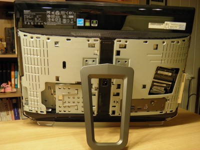 Konstrukčně je počítač řešený stejně jako většina velkých all-in-one: veškerý hardware je ukrytý v hlubším těle „monitoru“, o pár centimetrů je šasi nadzvednuté dvěma průhlednými nožičkami s gumovými koncovkami a zezadu podepřené masivní kovovou podpěrou, pomocí níž regulujeme sklon obrazovky mezi 15 – 40° a může částečně posloužit pro správu kabelů (i když těch je za normálních okolností naprosté minimum, vlastně pouze jeden – napájecí). Podpěra má na konci měkčený váleček, a tak není problém měnit sklon bez nutnosti počítač zvedat. Podpěru je možné odmontovat a počítač umístit na stojan standardu VESA s roztečí 100 mm (toto však nedokážu potvrdit).