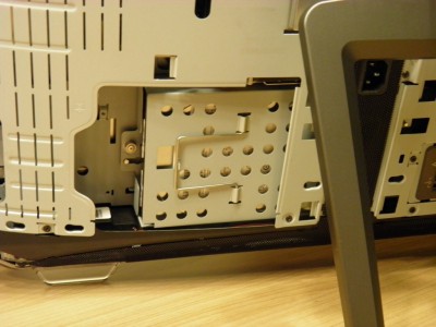 Zadní strana počítače je samozřejmě vystouplá a ukrývá veškeré komponenty. Najdeme zde dvojici velkých plastových krytů s povrchem imitujícím kov, které lze sejmout bez jakéhokoliv nářadí. Díky tomu získáme okamžitý přístup k vyměnitelným komponentám: pevnému disku a operační paměti.