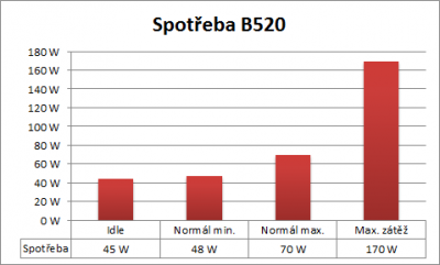 Při „volnoběhu“ (idle, kdy počítač pouze běží, ale nic se na něm nedělá) spotřebovává B520 zhruba 45 W (spotřeba pouze zhruba o 50 % vyšší než u velkého monitoru). Za normálního vytížení to je mezi 48 až 70 W, při maximálním vytížení, kdy procesor, paměťový systém i grafický čip pracují na plné obrátky (kombinace FurMarku a Prime95), dosáhne spotřeba ve špičkách až k 170 W. Doplním jen, že všechna měření byla provedena s maximálním jasem displeje.