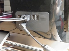 Většinu konektorů najdeme na zadní straně, ale některé – pro rychlý přístup – sídlí samozřejmě i na bocích, resp. vlevo, kde se nachází čtečka paměťových karet, dva USB 2.0 konektory a dva nutné audio konektory. Na pravoboku je to už jenom DVD optická mechanika. Zbytek už najdeme na rubu zařízení: čtveřici USB 2.0, gigabitový ethernet Realtek, no a pak už jen napájecí konektor (k C320 se dodává 140W napájecí adaptér). Z bezdrátových adaptérů je v C320 přítomno pouze Wi-Fi Realtek s podporou standardu 802.11n.