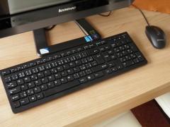 K základnímu all-in-one Lenovo dodává nové standardní drátové příslušenství v podobě ostrůvkové chiclet klávesnice, která jako by z oka vypadla té z ThinkCenterů Edge, a optické myši.