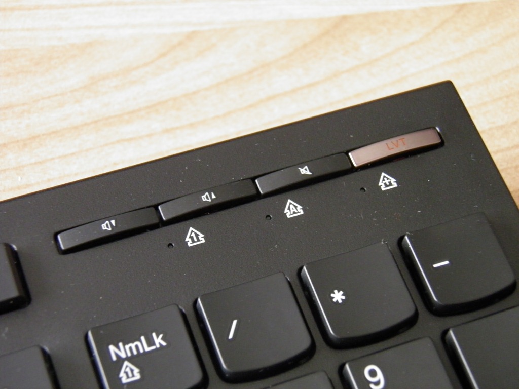 Tělo klávesnice má rozměry jen o kousek větší, než je vyloženě nutné – kolem prostoru pro klávesy tak přiliš volného místa nezbývá, což je pozitivní z toho pohledu, že je tak klávesnice velmi kompaktní. Na druhou stranu volitelná opěrka zápěstí by nebyla vůbec na škodu. Co se psaní na klávesnici týče, je vlastně stejné jako u zmíněné ThinkCentre klávesnice: stisk jednotlivých kláves je pocitově “gumový”, ale pozitivní a jistý, odpor je o něco větší než u notebookových klávesnic, také hloubka stisku je větší, což je u stolního počítače, myslím, dobře. Pozitivní je, že i tato klávesnice je odolná proti polití a disponuje odtokovými kanálky. Horní řada kláves nabídne po stisknutí oranžové klávesy Fn vedlejší funkce: spuštění internetového prohlížeče, spánek, vysunutí optické mechaniky a ovládání multimédií. Samostatně vpravo ještě stojí čtveřice výhradně funkčních kláves: ovládání hlasitosti a tlačítko “LVT”, které spustí Lenovo Vantage Technology Start Center (jednoduchý rozcestník aplikací a správy počítače).