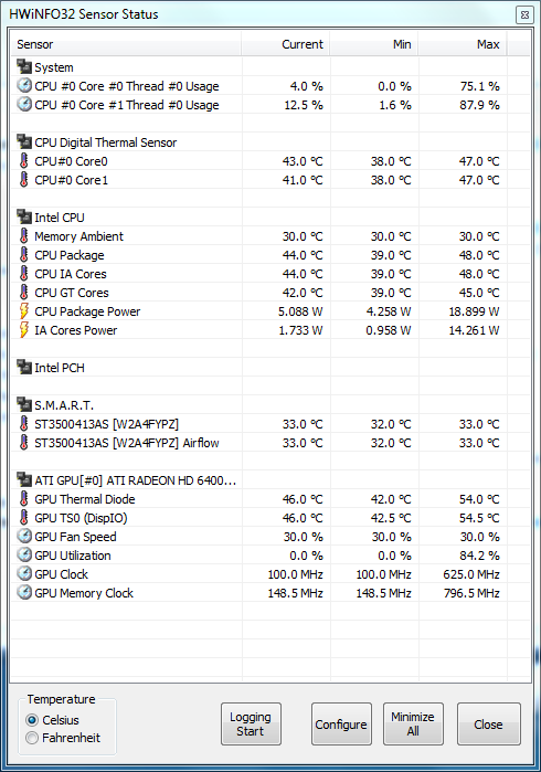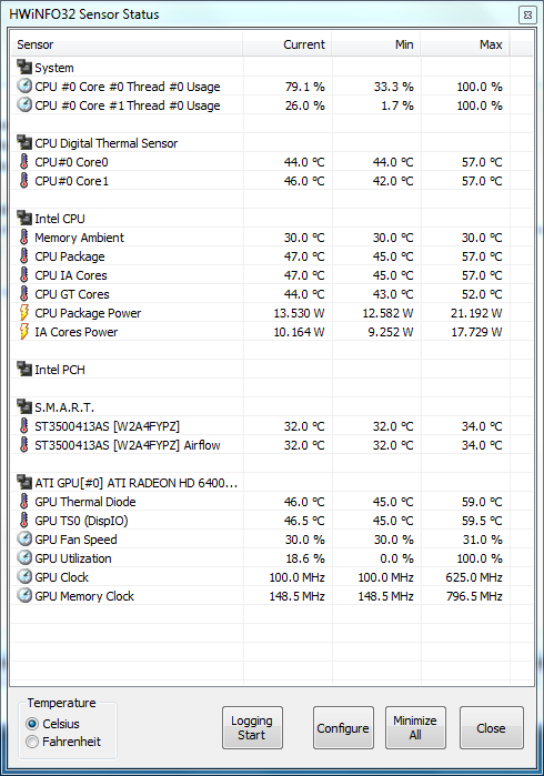 Jednou ze zásadních výhod all-in-one počítačů je kromě nekomplikovaného provozu, kompaktního provedení a redukce otravných kabelů také nízká spotřeba. “Naše” C320 drží s ostatními all-in-one díky úsporným komponentám a LED podsvícení displeje. V běžném provozu s maximálním jasem se spotřeba drží jen mírně nad 40 W, snížíme-li jas na minimum, už je to jen něco přes 30 W. V maximální zátěži (Prime95 + FurMark, tedy maximální zátěž CPU i GPU) to je příjemných 79 W. Všechny naměřené hodnoty jsou bez úsporných funkcí procesoru (bez podtaktování)!