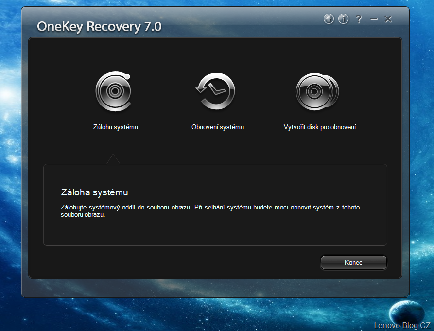 Obnovenie z predvolenej zálohy – predstavuje obnovu systému so skrytého oddielu, ktorý je súčasťou Lenovo zariadení. Pri tejto obnove dôjde k zmazaniu všetkých dát v systémovom oddiely (oddiely C) a tak pre použitím tejto funkcie si vždy zálohujte dôležité dáta.