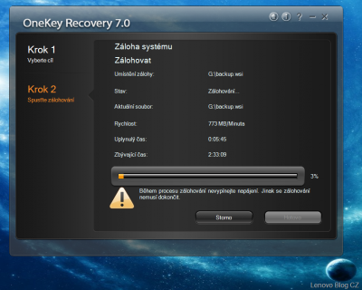 Druhým ktorom je samotné zálohovanie. Dĺžka závisí od veľkosti obrazu a tak môže trvať od pár minút po niekoľko hodín. Napr. 100GB obraz sa zálohuje na externý disk približne 3 hodiny a 45 minút.