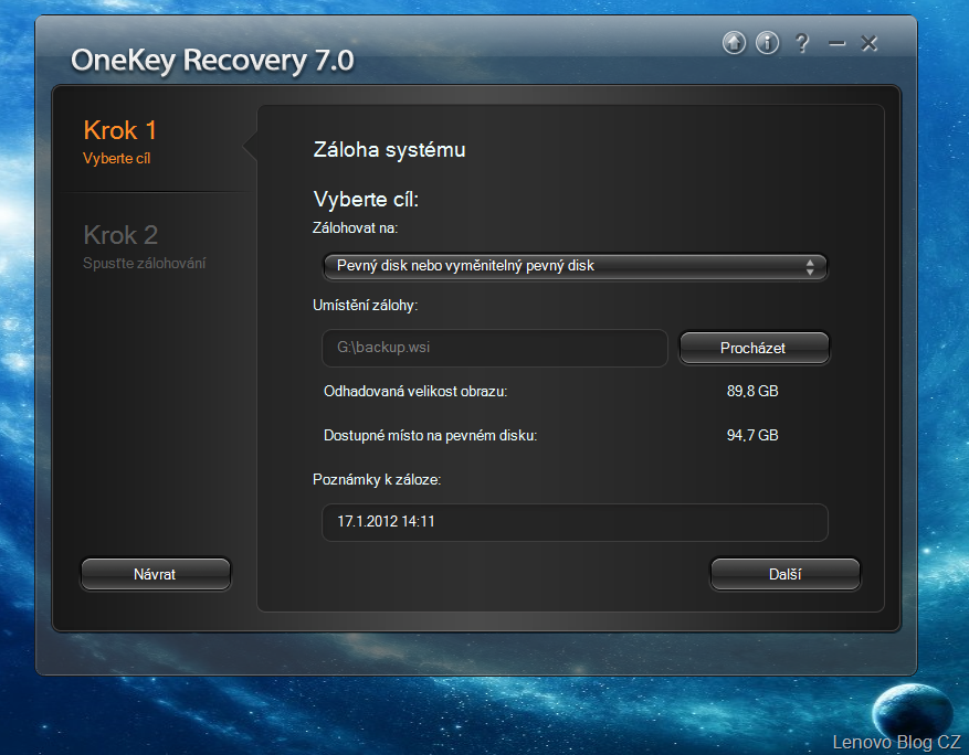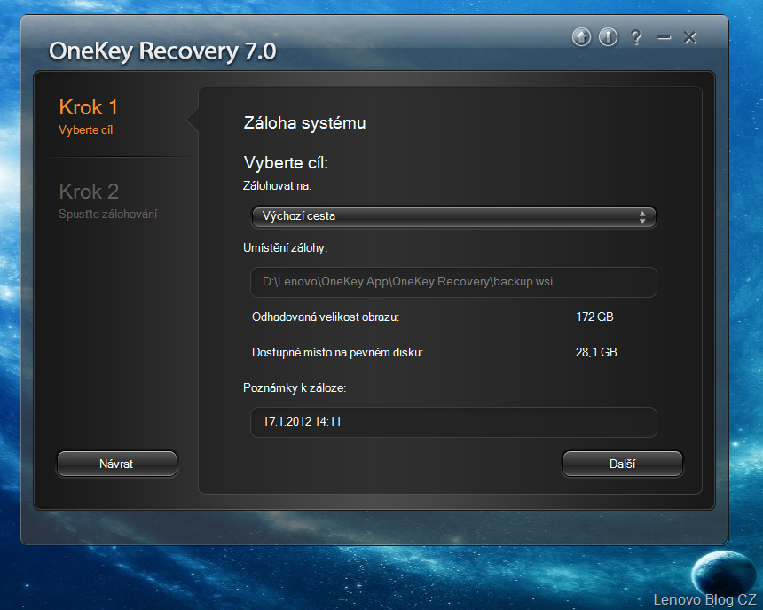 - predvolená cesta – D:\Lenovo\OneKey App\OneKey Recovery