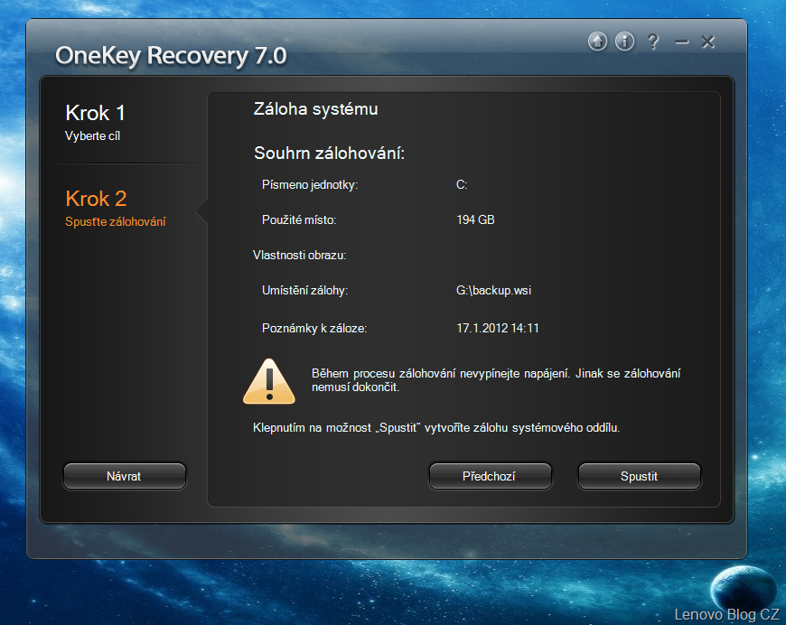 Ešte pred samotným zálohovaním vám systém ponúkne súhrn zálohovanie, ktorý obsahuje základné informácie o zálohovaní – písmeno jednotky, použité miesto, vlastnosti obrazu, umiestnenie zálohy, a poznámky k zálohe (dátum a čas zálohovania).