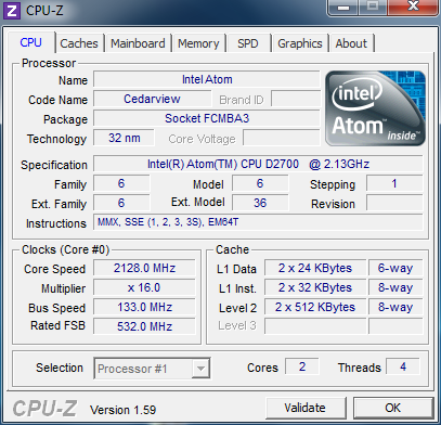 • Intel Atom D2700 (2,13 GHz, 2 jádra / 4 vlákna, TDP 10 W)