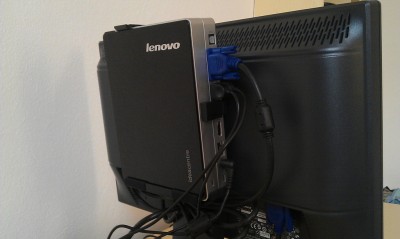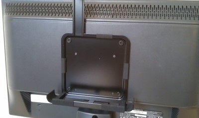 2. Zavěšený zezadu monitoru. V balení najdeme kovovou konzolku (alias “baťůžek”), kterou pomocí standardních VESA otvorů přišroubujeme ze zadní strany monitoru (obrazovky) a do ní Q180 vložíme, čímž v podstatě získáme nepravé all-in-one zařízení. K dispozici jsou dvě běžné rozteče šroubů: 100 mm i 75 mm. Pokud máte doma monitor, je to velmi levný způsob jak si pořídit all-in-one počítač, jen si budete muset poradit se správou kabelů (což však s konzolkou k mému překvapení není problém – i velmi provizorně to šlo, když si na tom člověk dá trochu záležet, výsledek bude uspokojivý).