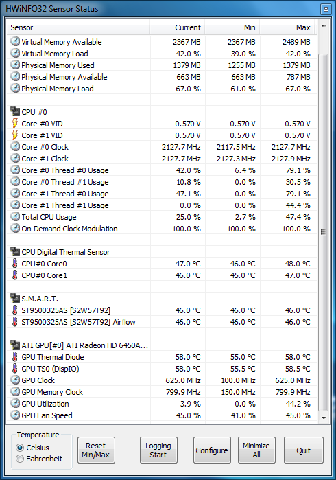 Přestože ze skříňky stále vychází vlažný vzduch, vnitřní komponenty jsou chlazené standardně, za běžné zátěže se procesor drží mezi 45-50°C, grafický čip do 60°C. Jen pevný disk má kvůli stísněnému šasi trochu vyšší teploty. Při vyšší zátěži teploty vzrostou zhruba o 10-15°C, nicméně v takovém režimu počítač provozovat delší dobu určitě nebudete (neustálá plná zátěž procesoru i grafiky).