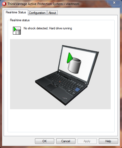 Po jejím spuštění se zobrazí výchozí záložka, prostřednictvím které můžeme na trojrozměrném modelu notebooku sledovat činnost Active Protection System (polohu notebooku a také, zda pevný disk běží, nebo je zastavený).