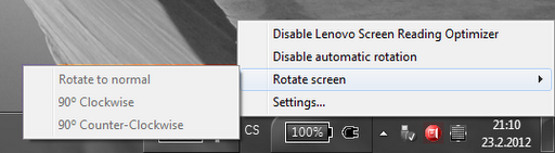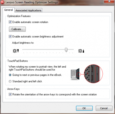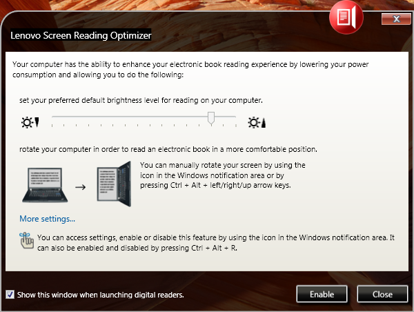 Druhou malou aplikací, kterou si v dnešním článku představíme, je Screen Reading Optimizer – drobná utilita, která má uživatelům notebooků ThinkPad ulehčit čtení elektronických dokumentů a přiblížit “zážitek” z něj jejich tabletovým protějškům. Velmi jednoduše řečeno: Screen Reading Optimizer rozpozná čtečku elektronických dokumentů a následně upraví podsvícení displeje a aktivuje automatickou změnu orientace zobrazení na základě gravitačního senzoru (tak, jak to známe např. z mobilních telefonů nebo tabletů) s ještě několika drobnými změnami.