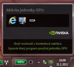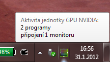 Pro mnoho uživatelů, kteří chtějí mít kontrolu a přehled nad přepínáním (k těm se řadím i já), je ale klíčové zjistit, která grafická karta se momentálně používá – zda úsporná integrovaná, nebo výkonná dedikovaná. Zvlášť nás to zajímá při běhu na baterii. Vzhledem k tomu, že systém Optimus je koncipovaný tak, že pracuje “neviditelně”, uživatel nepozná, že došlo k přepnutí grafické karty (resp. k aktivaci nebo deaktivaci čipu nVIDIA) – nedochází k žádným problikáváním obrazu, ani se nezobrazí žádné hlášení. To však neznamená, že přepínání nemůžeme monitorovat.
