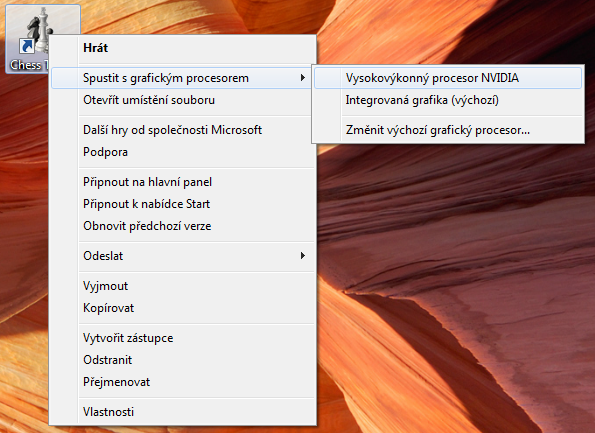 - Pomocí volby ve stejném menu jako zobrazení monitorovací ikony můžeme aktivovat v kontextových nabídkách výběr grafické karty, se kterou se má daná aplikace spustit. Pak na aplikaci klikneme pravým tlačítkem a vybereme grafickou kartu manuálně.