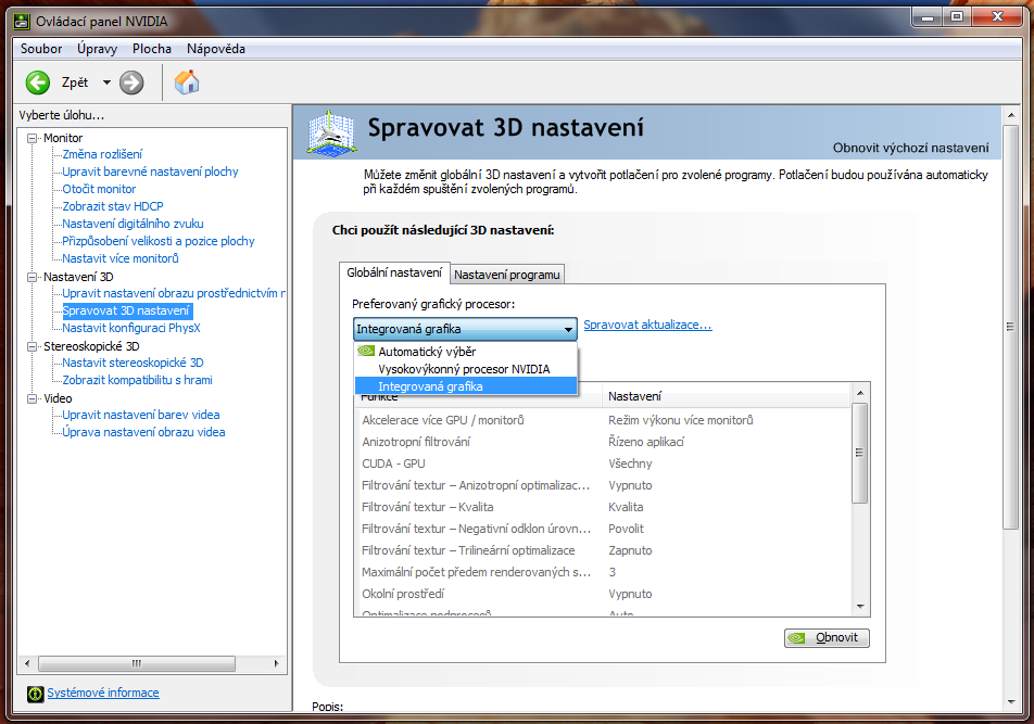 - V ovládacím panelu nVIDIA je možné vybrat preferovaný grafický čip (integrovaný/dedikovaný). Doporučuji vybrat integrovaný, jinak se dedikovaný čip spíná příliš často – i při činnostech, na které s přehledem stačí integrovaný čip (prohlížení internetu s Flash animacemi, HD video aj.).