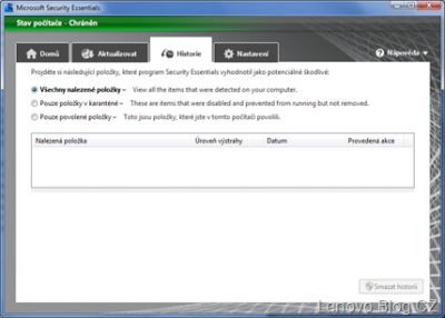 Nasleduje časť o Histórií položiek, ktoré MSE vyhodnotil ako potenciálne škodlivé. Môžete si pozrieť všetky nájdené položky, prípadne iba položky v karanténe alebo povolené položky. K dispozícií máte možnosť zmazania histórie. Položky v karanténe sú iba vypnuté, odstránenie musíte vykonať sami (v prípade, že ste v čase ich nájdenia nezvolili možnosť hneď odstrániť, potom ich už v karanténe nenájdete iba v časti všetky položky). V tejto sekcii je možnosť nielen vymazania, ale aj prípadného obnovenia činnosti daných aplikácií.
