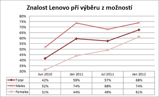 V pravidelných půlročních intervalech si Lenovo nechává vypracovávat průzkumy (nejenom) znalosti značky. Výsledky těch posledních dorazily v druhé polovině ledna a my si v dnešním článku ty zajímavější závěry a výstupy projdeme. Srovnávat budeme až rok a půl dozadu (červen 2010, leden 2011, červen 2011, leden 2012).