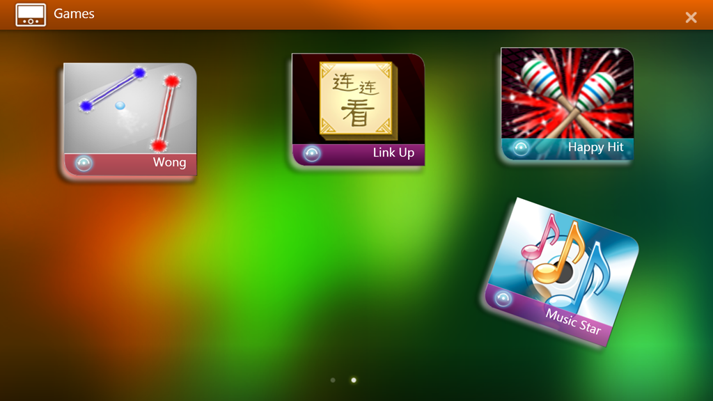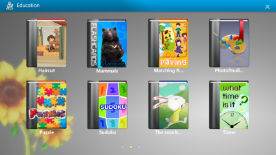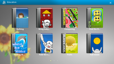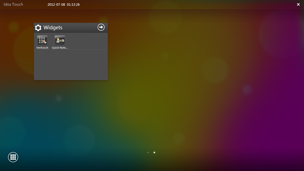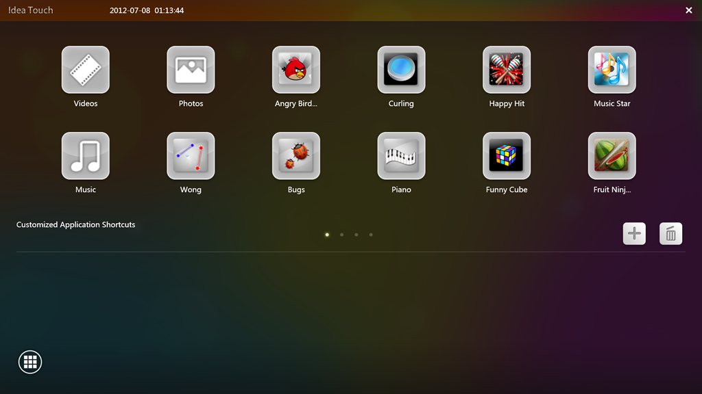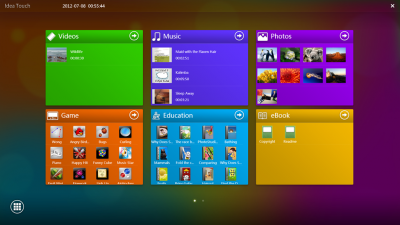 Úvodná obrazovka pri zapnutí IdeaTouch vám zobrazí základný graficky príťažlivý prehľad jej ponuky zahrňujúci Videá, Hudbu, Fotky, Hry, Vzdelávanie, eKnihy a Widgety.