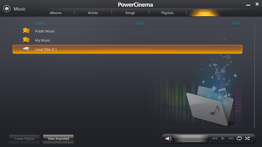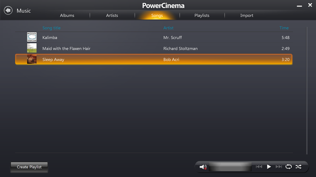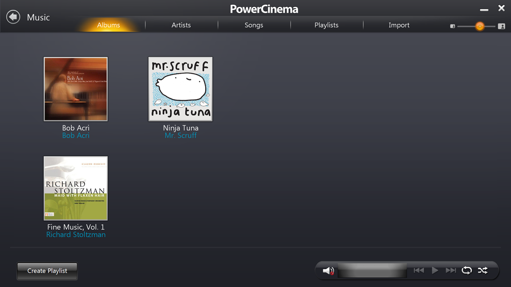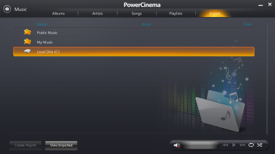 Hudba vám ponúka takisto jednoduchý prehľad a hľadanie medzi vašou hudbou a opäť vytvorenie playlistu pre jej pohodlné prehrávanie a zoskupovanie. Rovnako si môžete vybrať viaceré možnosti zobrazenia: Albumy, Hudobníci, Skladby, Playlisty. Pre vloženie ďalšej hudby je k dispozícií časť venovaná importu (vloženiu) z rozličných úložných zariadení a zložiek.