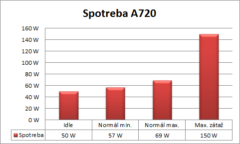 Spotreba pri takejto konfigurácii a veľkosti displeja je primeraná. Ak bol all-in-one v nečinnom stave, kedy bol len zapnutí a nepracovalo sa na ňom, tak dosahoval spotrebu 50W. Pri bežnej činnosti ako je písanie dokumentov, surfovaní po internete a počúvaní hudby boli hodnoty v rozmedzí 57–69W. Prezeranie videí sa hodnoty pohybovali okolo 60W, a po pridaní činností bežných sa spotreba nemenila. Maximálna záťaž vyšvihla hodnoty pohybujúce sa okolo 150W.