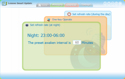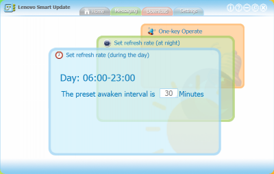 - Settings (Auto-update) – kde si nastavíte: zapnutie/vypnutie Lenovo Smart Update, obnovovaciu frekvenciu počas dňa aj noci.