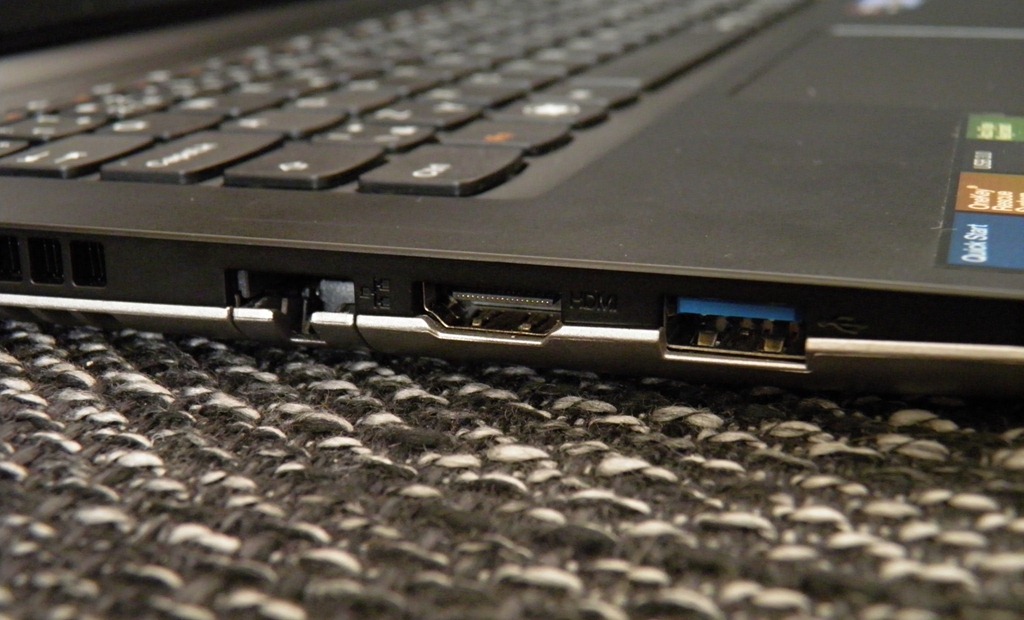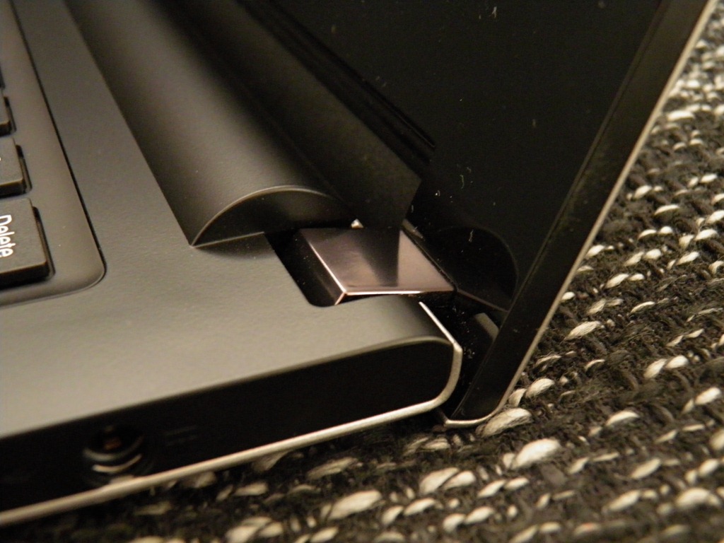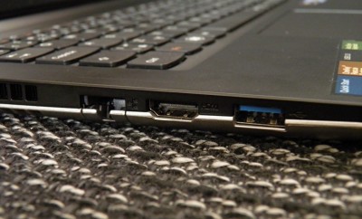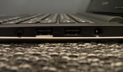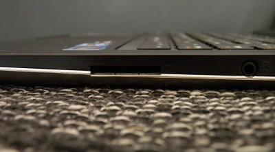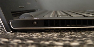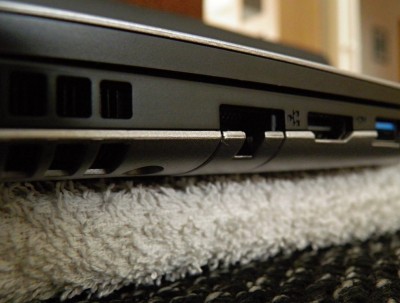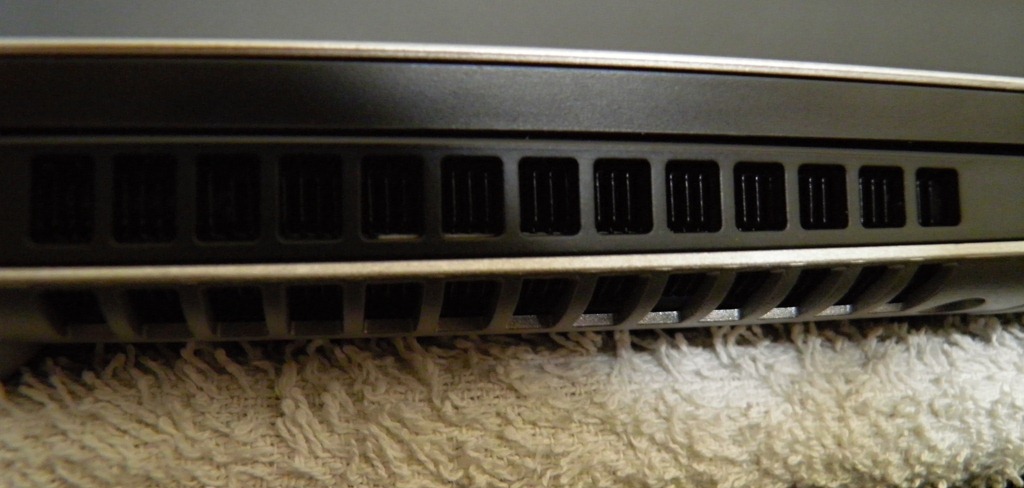 Novinkou v sekcií konektorov je nový LAN port, ktorý sa pre zachovanie tenkosti notebooku v prípade použitia pootvára a pokiaľ vám nie je treba, tak ostáva v polozatvorenom stave. Chladenie sa taktiež mierne zmenilo s oddelenými otvormi pred a za záhybom.