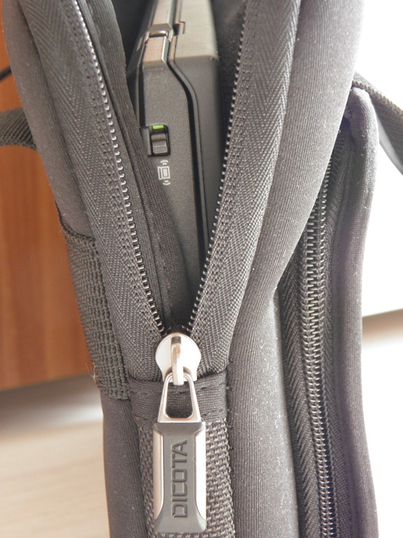 Hlavní prostor určený pro notebook má oficiální vnitřní rozměry 340 x 40 x 245 mm, čili bez problému do něj vložíme 14″ ThinkPady i s rozšířenou 9článkovou baterií. Osobně jsem zkoušel T420s a T420, oba se v pouzdře cítily jako doma a úplně perfektně jim bez jakéhokoliv pnutí padlo, jako by pro ně bylo ušité – na šířku odpovídá na milimetr, na výšku zůstane s šestičlánkem rezerva cca 2,5 cm, což se hodí právě pro přečnívající baterii, která prostor vyplní přesně (bude pak ale vhodnější notebook vkládat čelní stranou dolů). Dodám ještě, že se do tašky notebook vkládá shora po rozepnutí zipu (tedy “toploader” taška), ochrana proti odírání notebooku od zipu je výborná, resp. lepší než u ostatních sleevů, které jsem zkoušel, slouží zároveň jako ochrana před prosakování vody skrze zip, ten však mohl mít trochu plynulejší chod, ale to je do jisté míry vlastnost zipů s krytými zoubky.