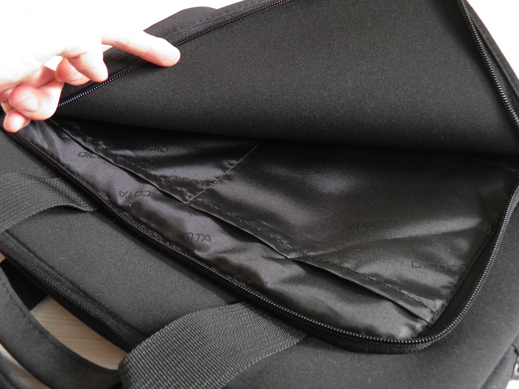 Sleeve dále překvapí vnitřním prostorem, který je totiž rozdělený na dvě části, resp. je mu přidána vnitřní kapsa. Nic záludného v tomto ohledu nehledejme, prostě je uvnitř pouzdra na straně s logem Dicota (další důvod, proč oceníte, že tam je) našitý předěl z klasicky tenoučké nylonové látky, do kterého můžeme uložit např. dokumenty. Jelikož zabírá celou vnitřní plochu, nebudou v něm papíry či bloky A4 vyloženě stísněné, ale najde se kolem nich ještě nějaký prostor pro snadnou manipulaci či vložení několika dalších listů. Pokud ale dokumenty nepřenášíte, upřímně vám bude – podobně jako mně – kapsa spíše překážet při vkládání notebooku. Dodatečné vnitřní polstrování PerfectSkin žádné nemá, čili vystačit si musíme pouze s neoprénem.