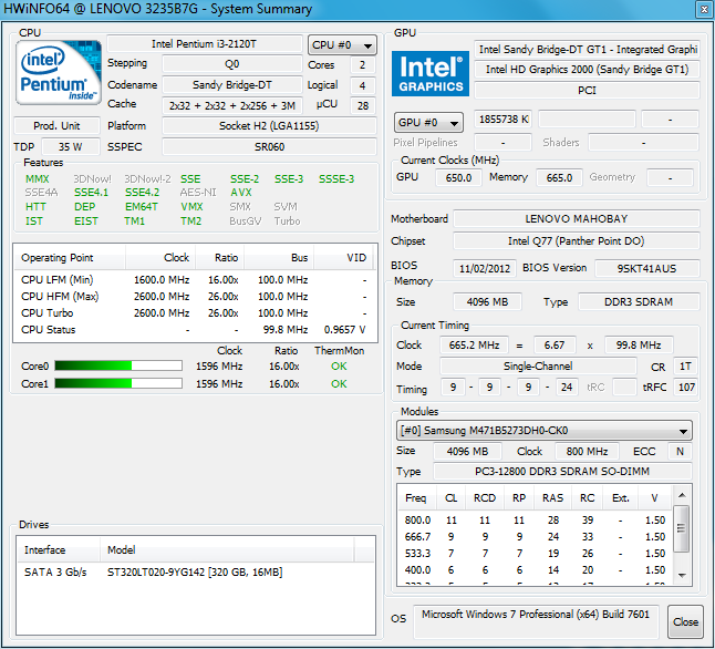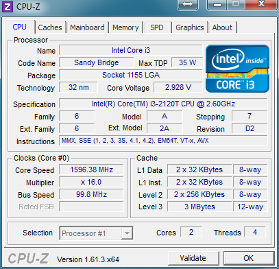 - Intel Core i3-2120T (2 jádra / 4 vlákna, 2,6 GHz, 3 MB L3 cache, TDP 35 W, LGA1155)