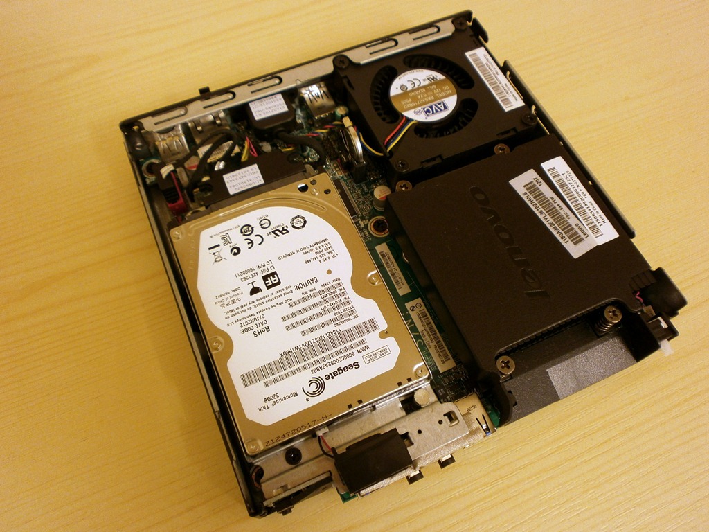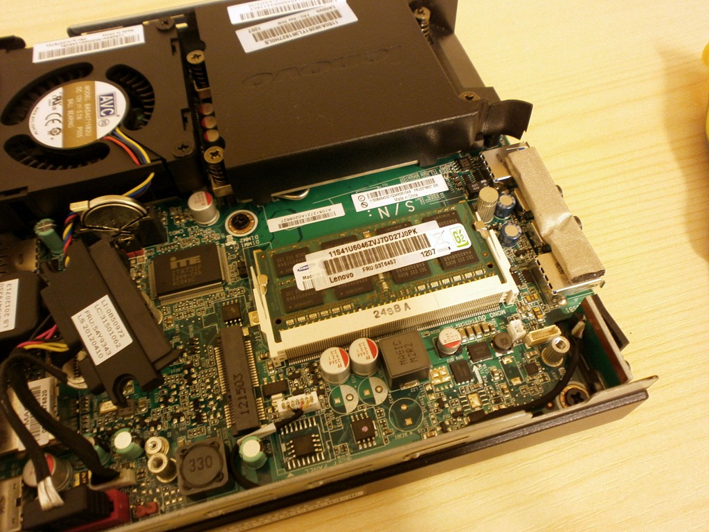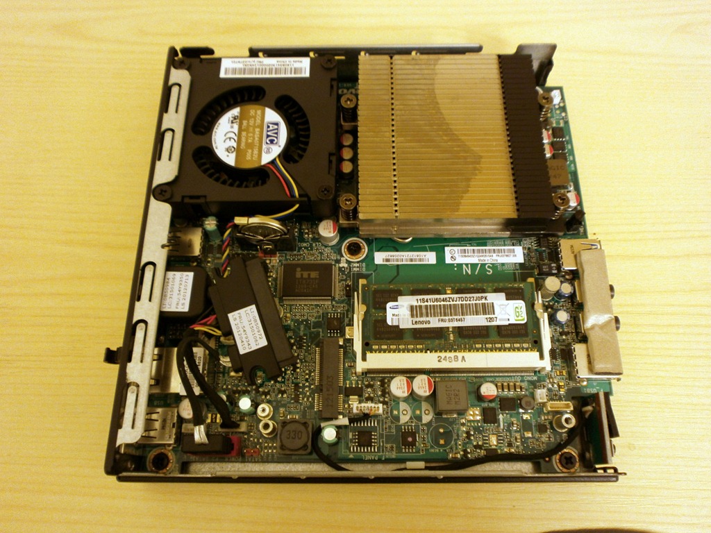 ThinkCentre Tiny ve svém tvrdém, kovovém šasi ukrývá adekvátně miniaturní základní desku a hardware, který pro minimalizaci rozměrů kombinuje notebookové a úsporné desktopové komponenty. Základní deska je vlastního návrhu Lenovo s plnohodnotnou business čipovou sadou Q77. Najdeme na ní vedle patice procesoru, dvojice SATA 3 konektorů (jeden použit vestavěným 2,5″ diskem – ten je připevněný na kovovém rámečku, vibrace eliminují gumové podložky) a dvou notebookových (SODIMM) slotů pro DDR3 operační paměť také mPCI-E konektor pro Wi-Fi.
