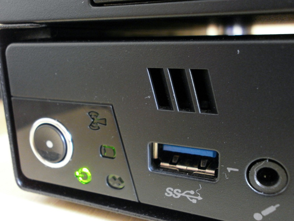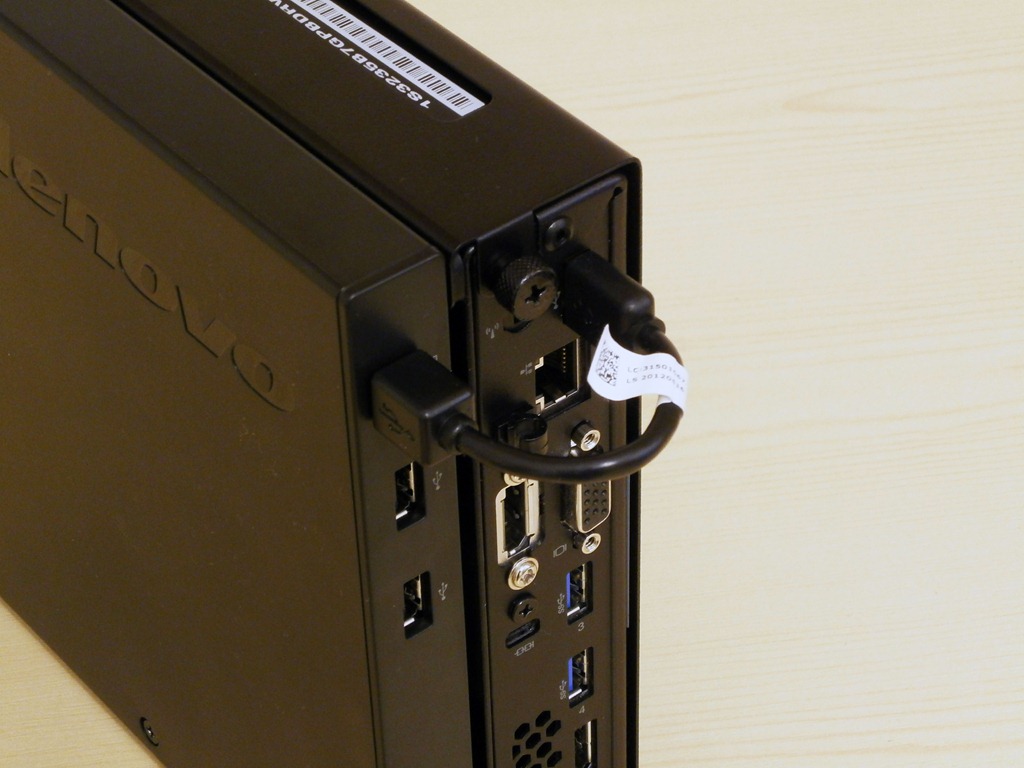 V miniaturním desktopu samozřejmě nemůžeme očekávat konektorovou výbavu velkého desktopu, nicméně Lenovo myslelo na vše, co by takový počítač měl nabízet. Začnu přední stranou s konektory pro rychlý přístup: zde najdeme dva USB 3.0 konektory a dvojici audio zdířek (mikrofon a sluchátka).