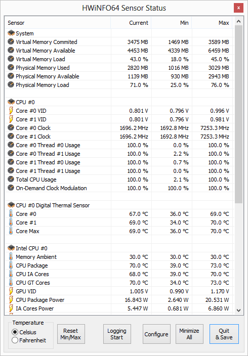 Teplota pri záťažovom teste + takt procesora