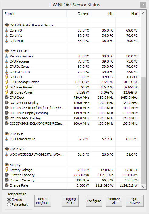 V prípade záťažového testu dosahovala teplota na jednotlivých miestach notebooku tieto hodnoty (po 20 minútach tohto testu):